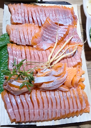 그리고 마침내, 오늘의 주인공인 송어회가 등판했습니다. 윤기가 자르르 흐르는 선홍빛 살결이 '나 엄청 신선해!'라고 온몸으로 말하고 있었죠.