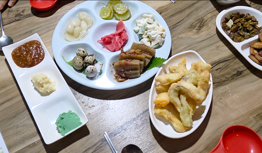 바삭하게 튀겨낸 송어 튀김, 추억의 건빵과 짭조름한 뻔데기. 화려하진 않지만 자꾸만 손이 가는 정겨운 밑반찬들이었어요. 그리고 커다란 그릇에 상추, 깻잎, 양배추, 고소한 콩가루가 듬뿍 담긴 비빔 야채! 여기에 테이블에 놓인 초장과 참기름을 취향껏 넉넉히 두르고 쓱쓱 비벼주면 송어회를 맞이할 준비는 끝납니다.