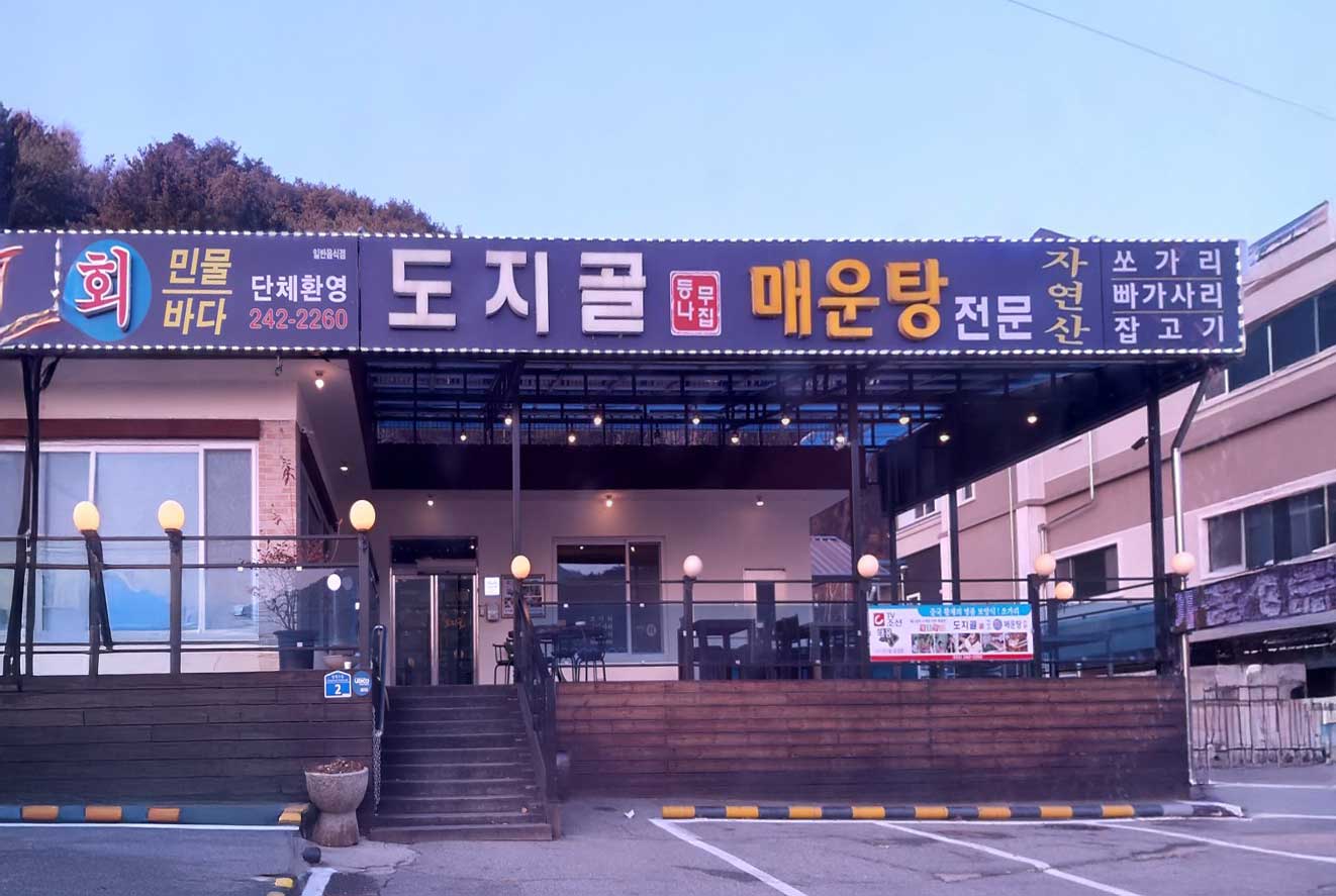 화려한 도심을 벗어나, 자연 속에서 진정한 '쉼'과 '맛'을 느끼고 싶다면 **'도지골등나무집'**이 정답입니다. 이름에서부터 정겨움이 느껴지는 이곳은, 쏘가리, 빠가사리 등 신선한 민물고기를 이용한 매운탕 전문점이죠.