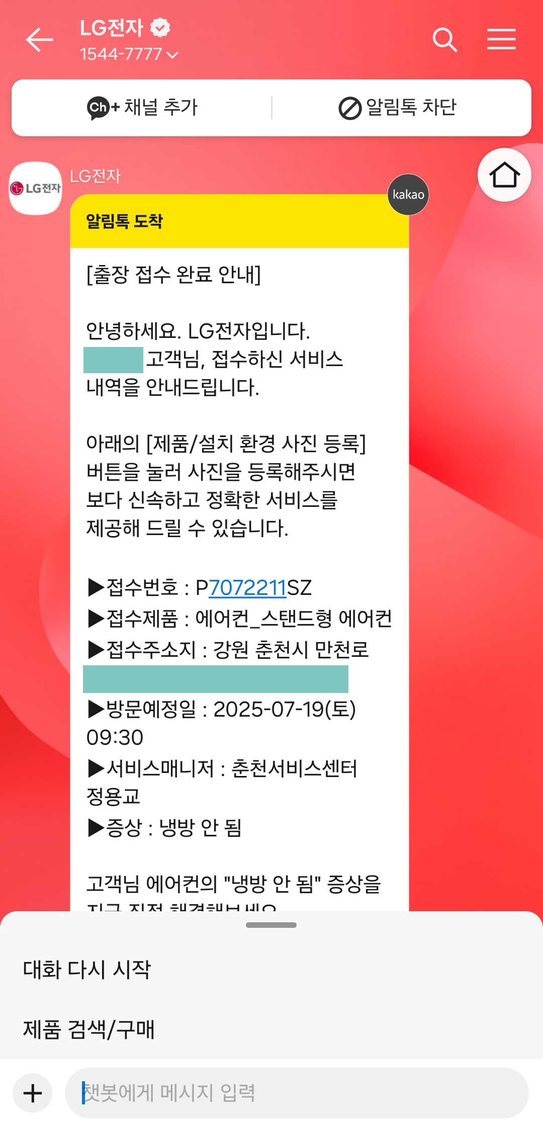 결국 백기를 들고 LG 서비스센터에 A/S를 신청했습니다. 가장 빠른 날짜가 일주일 뒤인 토요일 오전... 일주일 동안 찜통더위와 싸울 생각을 하니 눈앞이 캄캄하더군요. 🥵